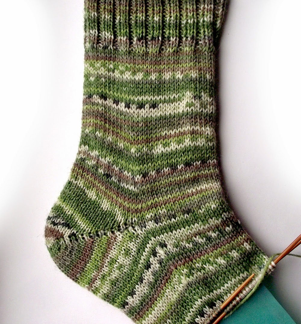 Для работы я использую носочную пряжу Opal HANDWERK & HOBBY (75% шерсть superwas, 25% полиамид, 425 м/100 гр.) и чулочные спицы из карбонизированного бамбука №2.5 длиной 13 см. Для носков такая длина еще более удобна, чем привычная мне в последнее время 15 см - еще меньше движений рукой, еще быстрее вязание. Носок в моем случае вяжется на 64 петлях. Вязание укороченными рядами рассматривалось в уроке по носочной пятке с клином, в случае возникновения затруднений с выполнением укороченных рядов можно освежить память, перечитав МК по пятке с клином.